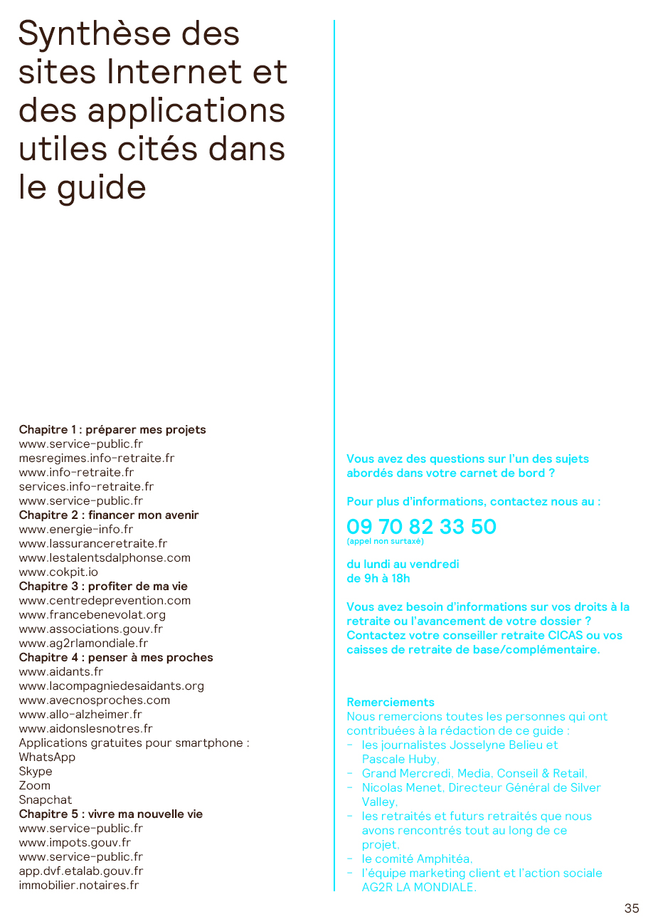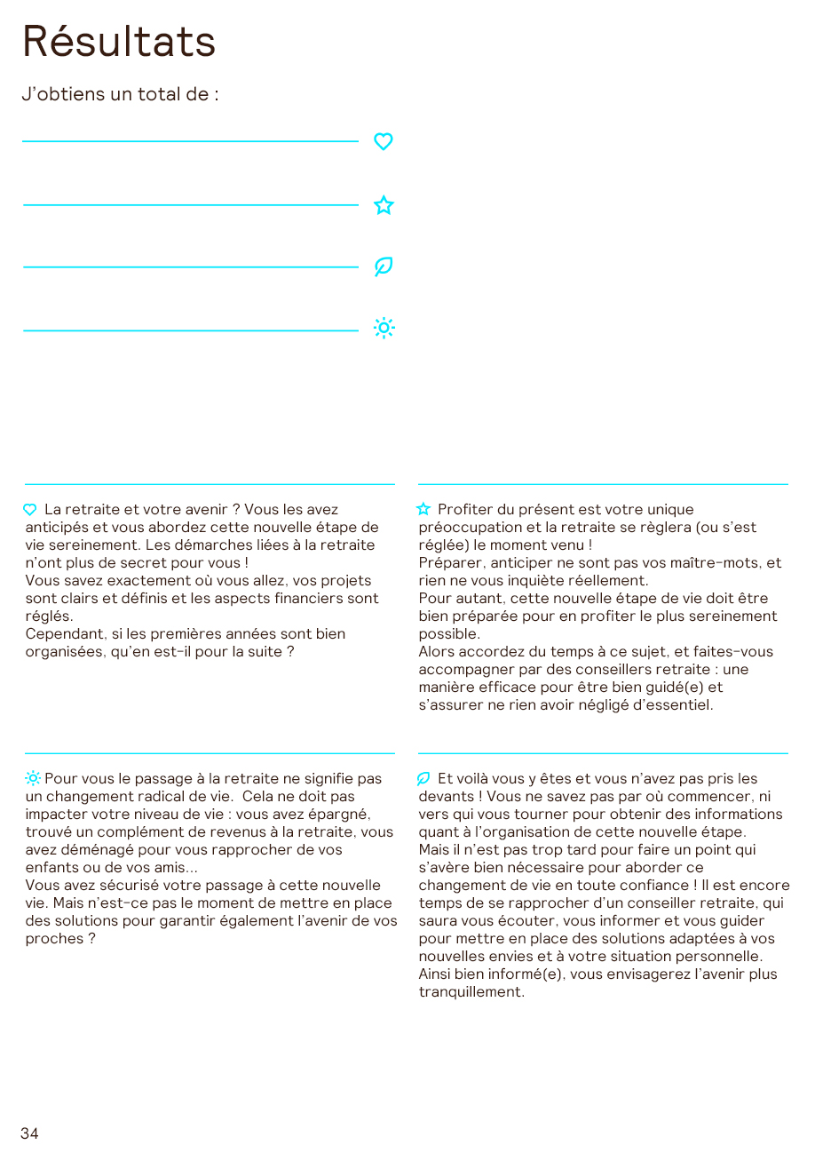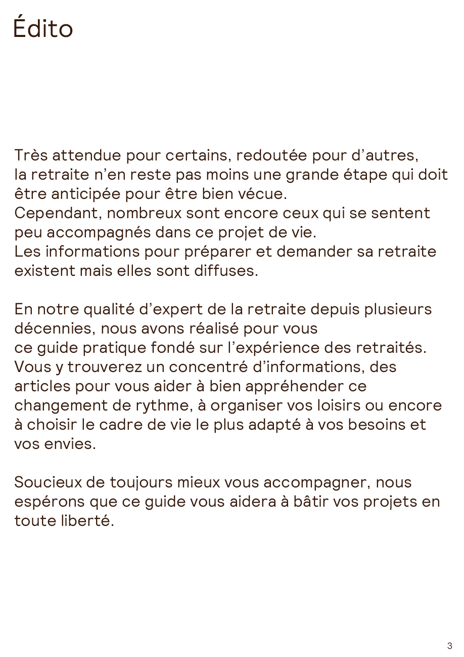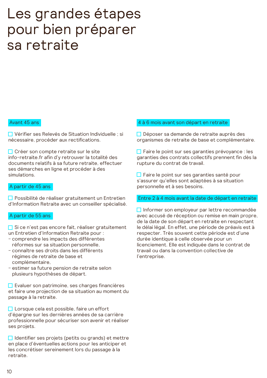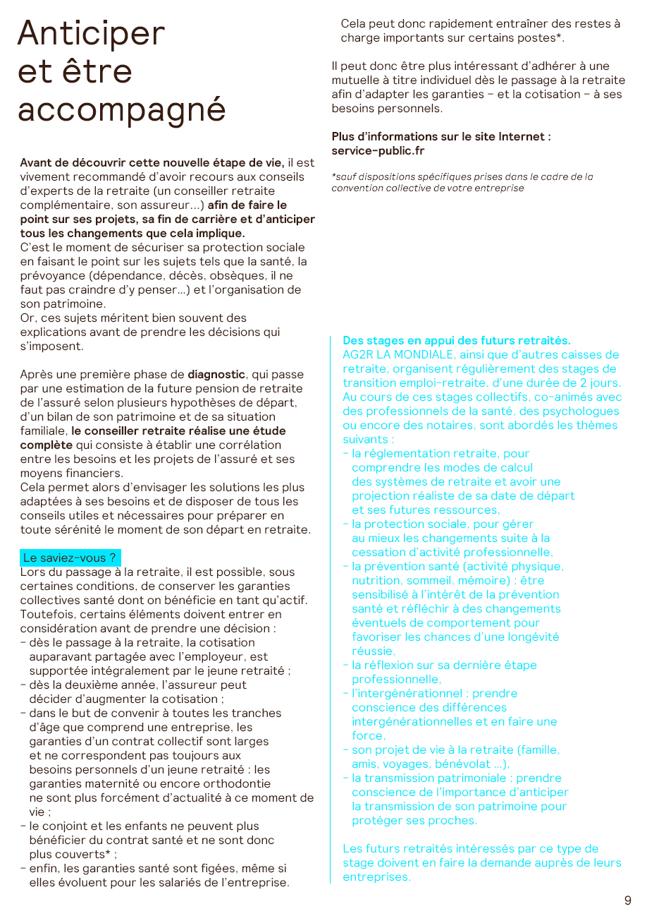Avant de découvrir cette nouvelle étape de vie, il est vivement recommandé d’avoir recours aux conseils d’experts de la retraite (un conseiller retraite complémentaire, son assureur...) afin de faire le point sur ses projets, sa fin de carrière et d’anticiper tous les changements que cela implique.